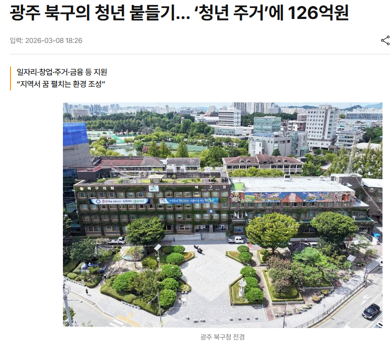 보도 / 홍보자료 광주 북구의 청년 붙들기… ‘청년 주거’에 126억원 페이지 정보 조회 6회 작성일2026-03-09 본문 https://www.kmib.co.kr/article/view.asp?arcid=1772952185&code=11131423&cp=nv 첨부파일 청년.png [902316 byte]